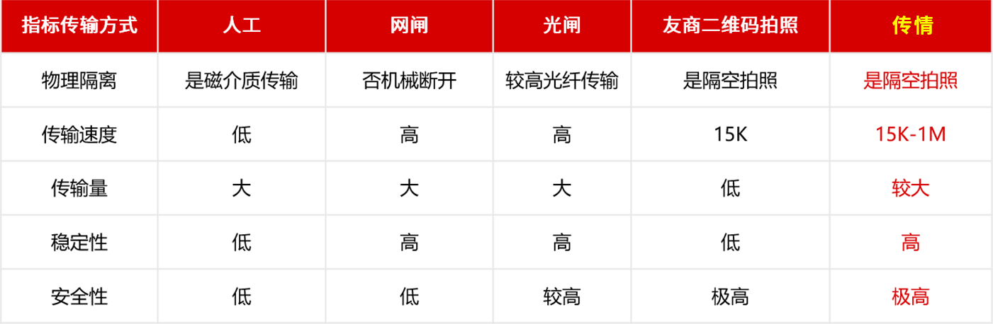 为了解决跨网安全传输特定图片、视频数据难,传统手段安全保密性差,仅通过二维码摆渡技术的转换效率低、成功率低的难题,我们首创通过将动态二维码作为索引,结合高速拍照、录像组合成“动态二维码+照片视频流”,通过工业摄像头和工业屏跨网拍摄,传输速率在15K(全转二维码)至1M(以高速拍照为主)。从而实现了物理隔离跨网安全数据传输。