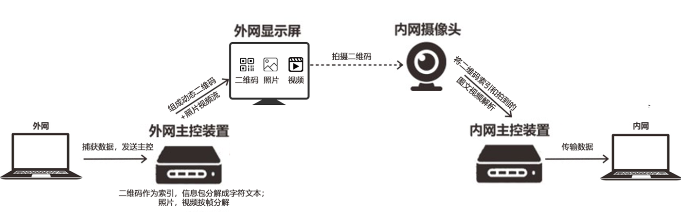 该系统的主要组件包括外网主控装置、外网显示屏、内网摄像头以及内网主控装置。具体的工作流程如下:外网主机捕获数据后,将其发送至外网主控装置。随后,外网主控装置将数据进行组装,将待发送数据中的照片和视频(按帧成图),标引出来。用动态二维码将字符、照片序号和张数等形成索引,再将照片和按帧成图的视频按每张0.1秒的速度播放在外网的显示屏上。内网的摄像头对外网显示屏进行拍摄,并对拍到的信息进行解析,直接将二维码的索引和拍到的图像解析还原,再将还原后数据通过连接内网的内网主控装置,被安全地移交至内网系统中。