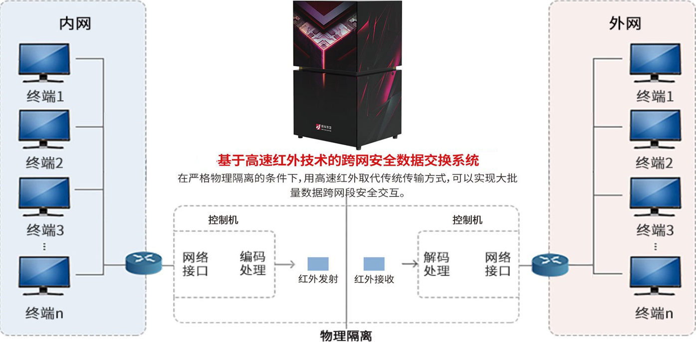 为了解决跨网安全传输特定图通用数据跨网传输要安全、实时、高速,传统网闸光闸安全保密性有待提升,基于空气隔离的传统红外传输速度慢,数据传输不稳定。的难题,团队历经多年潜力研究,取得重大突破,开发出了高速红外跨网通用安全数据交换系统,对传统网闸光闸进行了补充和提升。